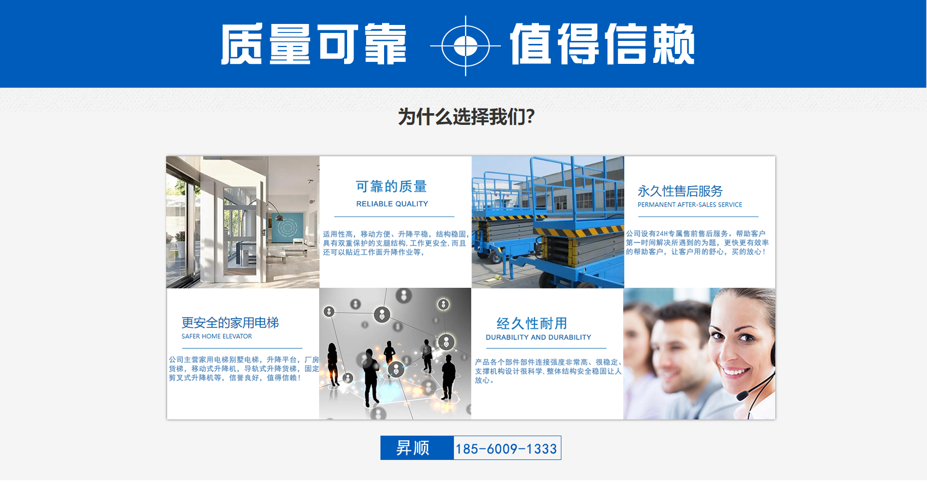 山東昇順液壓升降機械有限公司是一家主營家用電梯,別墅電梯,升降平臺,廠房貨梯,移動式升降機,導軌式升降貨梯,固定剪叉式升降機等產品企業,質量可靠,值得信賴?! ∮脩糁辽?,以用戶為中心”是公司永遠堅持的服務宗旨,贏得用戶的贊許是我們的榮譽,及時滿足用戶的需求,是我們公司的愿望。長期以來,公司員工以優質的服務,取悅于用戶,以誠信的言行取信于用戶,得到了用戶們的好評。我們期待著與您更加愉快的合作!公司的發展,離不開社會的大力支持,在社會的支持和幫助下,我們正昂首闊步邁向未來! 我們的經營方針是:以質量求生存,以產品求發展,以信譽保合作,以服務贏客戶?! ”竟緦Ξa品質量和各項服務恪守合同承諾,并愿與新老客戶精誠合作,共創未來。 公司精神:創新是主題,超越是不懈的追求?! 」咀谥迹盒抛u保證,誠信為本?! ∥覀儠院侠淼膬r格,良好的信譽,雄厚的實力,優質的產品,最周到的服務,服務于廣大新老客戶!...